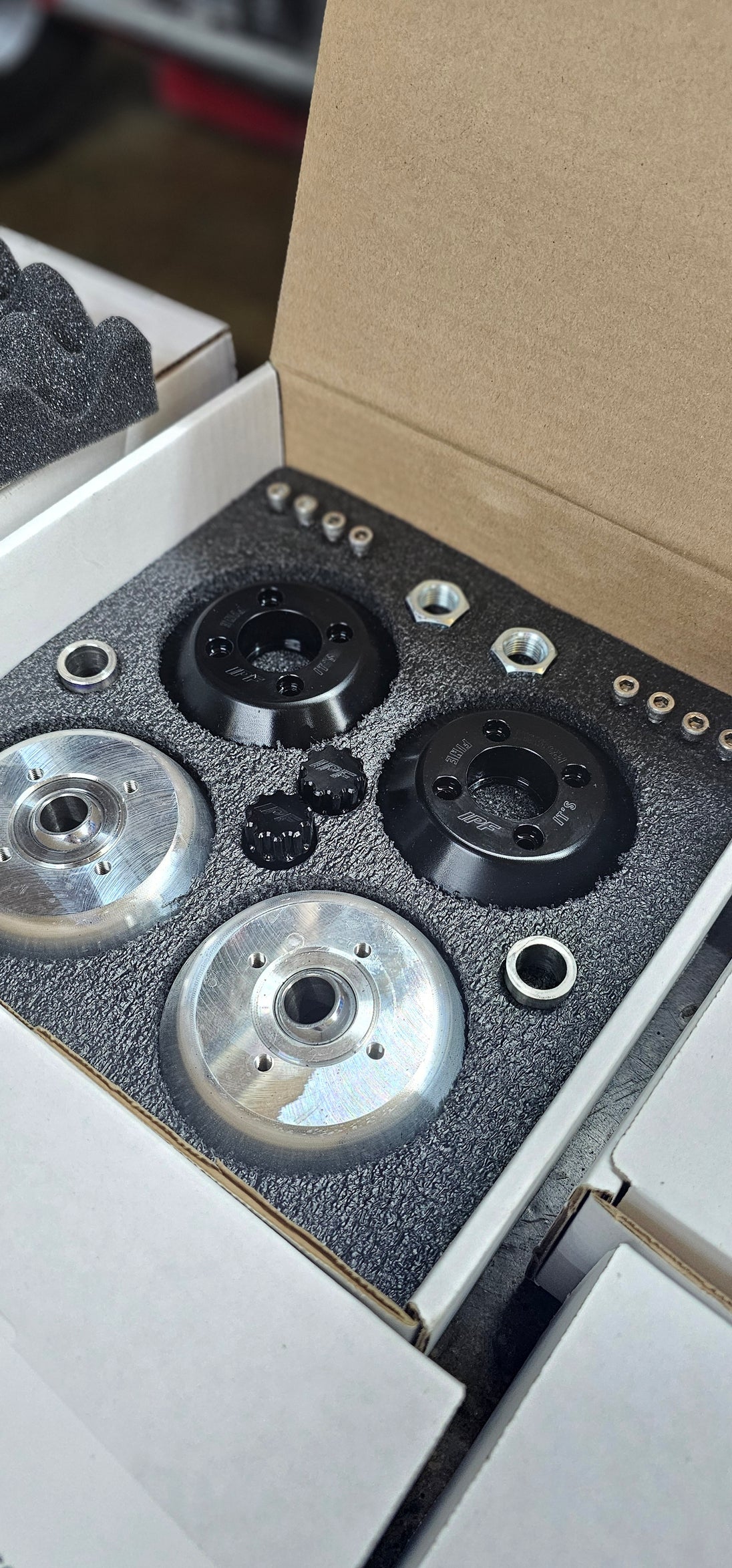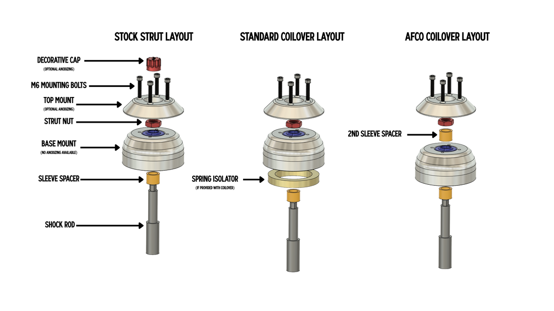 THESE ARE IN STOCK AND SHIP NEXT BUSINESS DAY UNLESS ANODIZING IS REQUESTED. ANODIZING ADDS UP TO 1 WEEK. PLEASE READ FULL PRODUCT DESCRIPTION BEFORE ORDERING. THESE FIT STOCK STRUTS AND COILOVERS DESIGNED TO UTILIZE A STOCK BUSHING, INCLUDING AFCO.