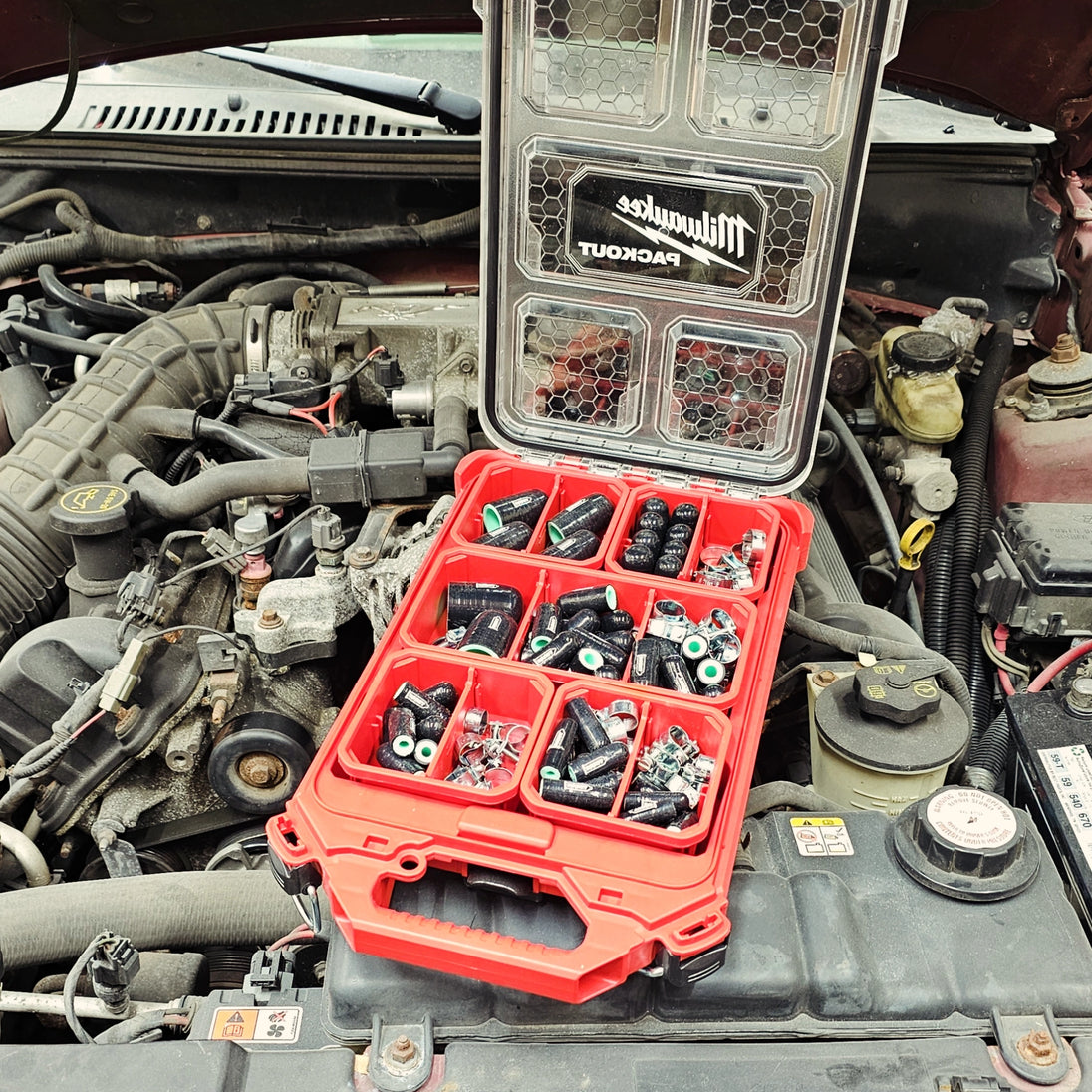 -Shop pack includes 10 of 1/8, 3/16, 1/4, 5/16, 3/8. 8 of 1/2, 4 of 3/4 and 2 of 1in packaged in a compact slim Milwaukee Packout. Shop refills are identical without the packout case.